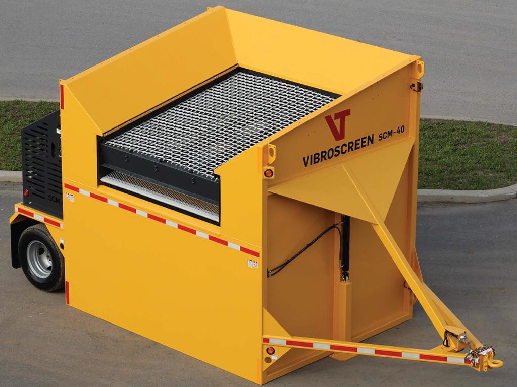 The SCM-40 Vibroscreen is ideal for a loader with a bucket of 1 to 3 cubic yards. The SCM-40 Vibroscreen has a screen surface of 40 square feet. The vibrating head with two decks offers a screening capacity of up to 100 cubic yards per hour.