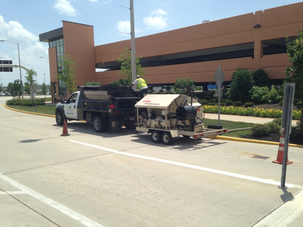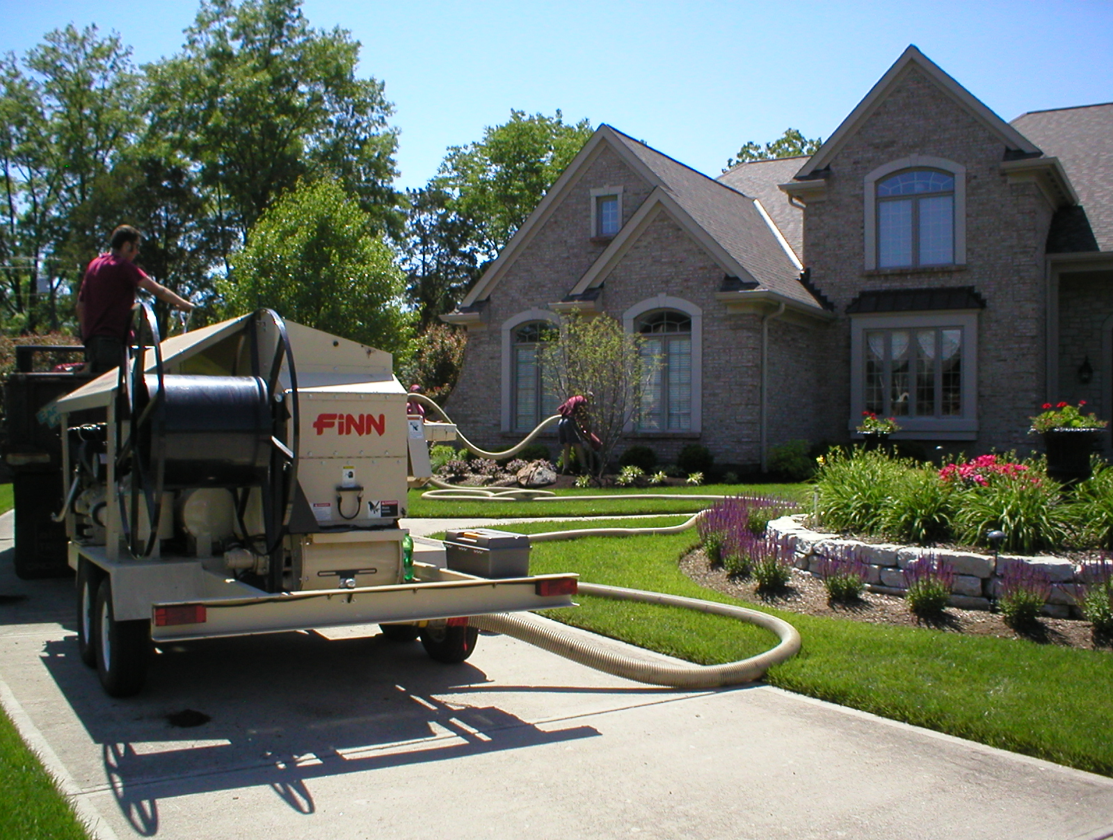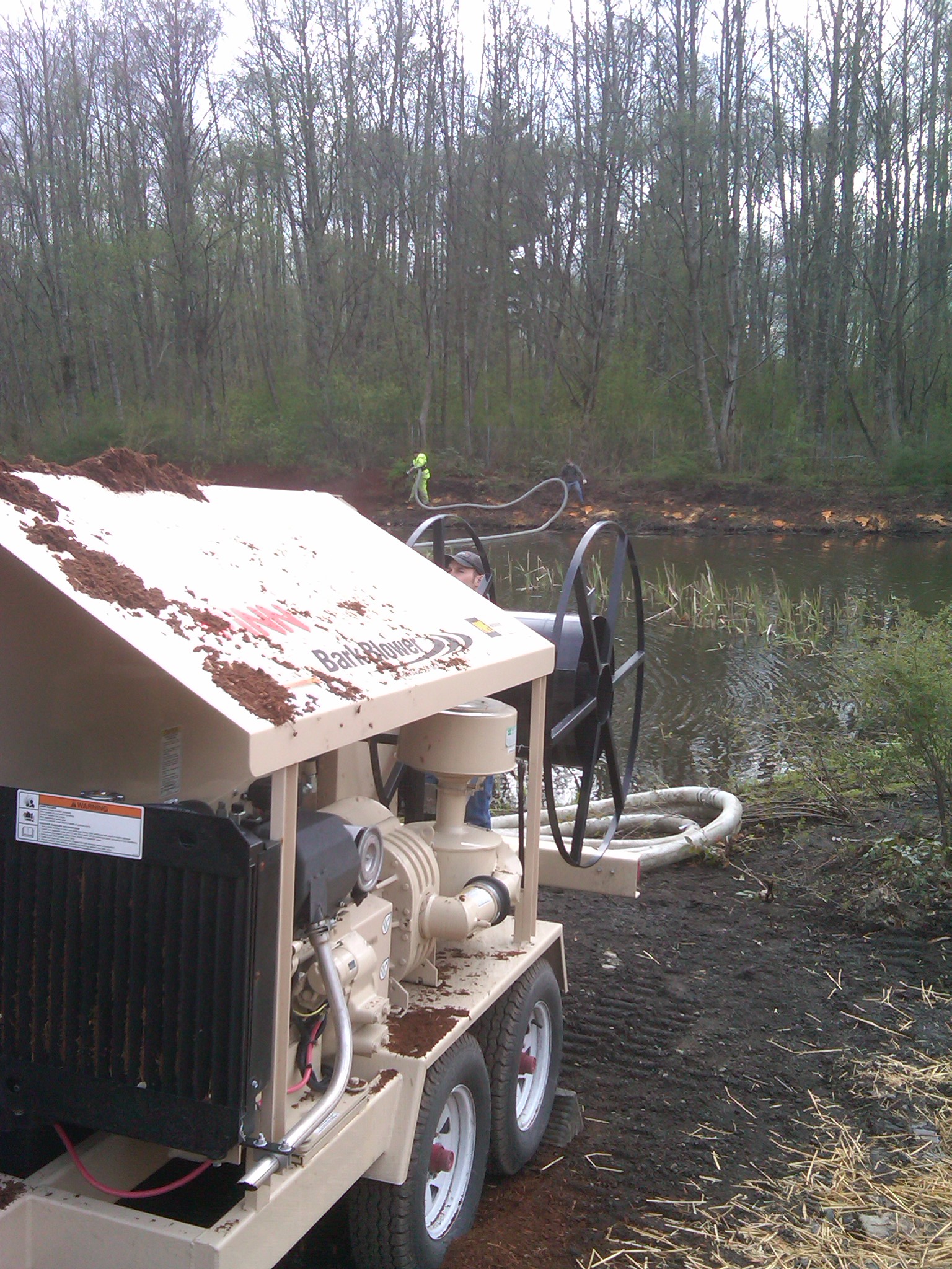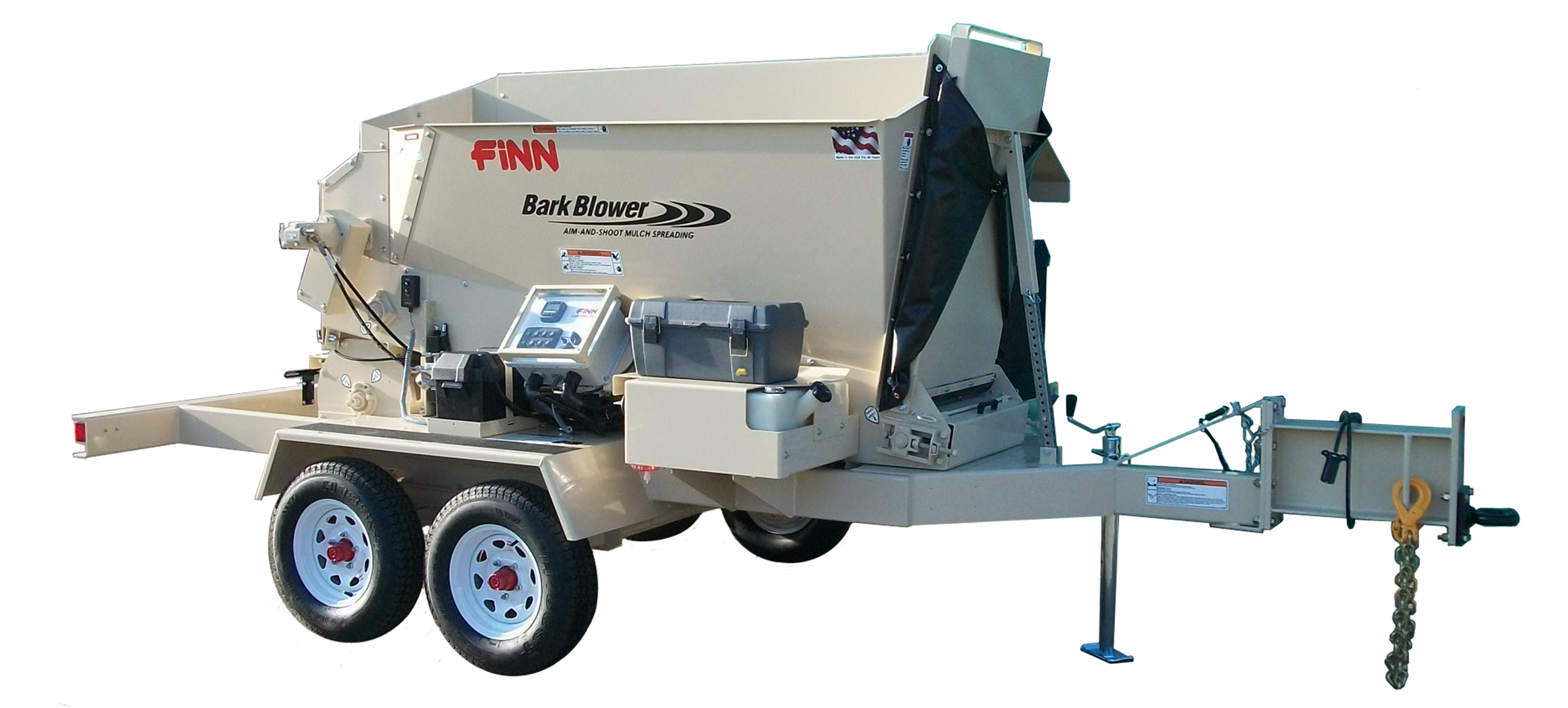 - Mulch is propelled through a specially engineered airlock and blower system through various lengths of durable 4” flexible hose for application up to 200’ away from unit