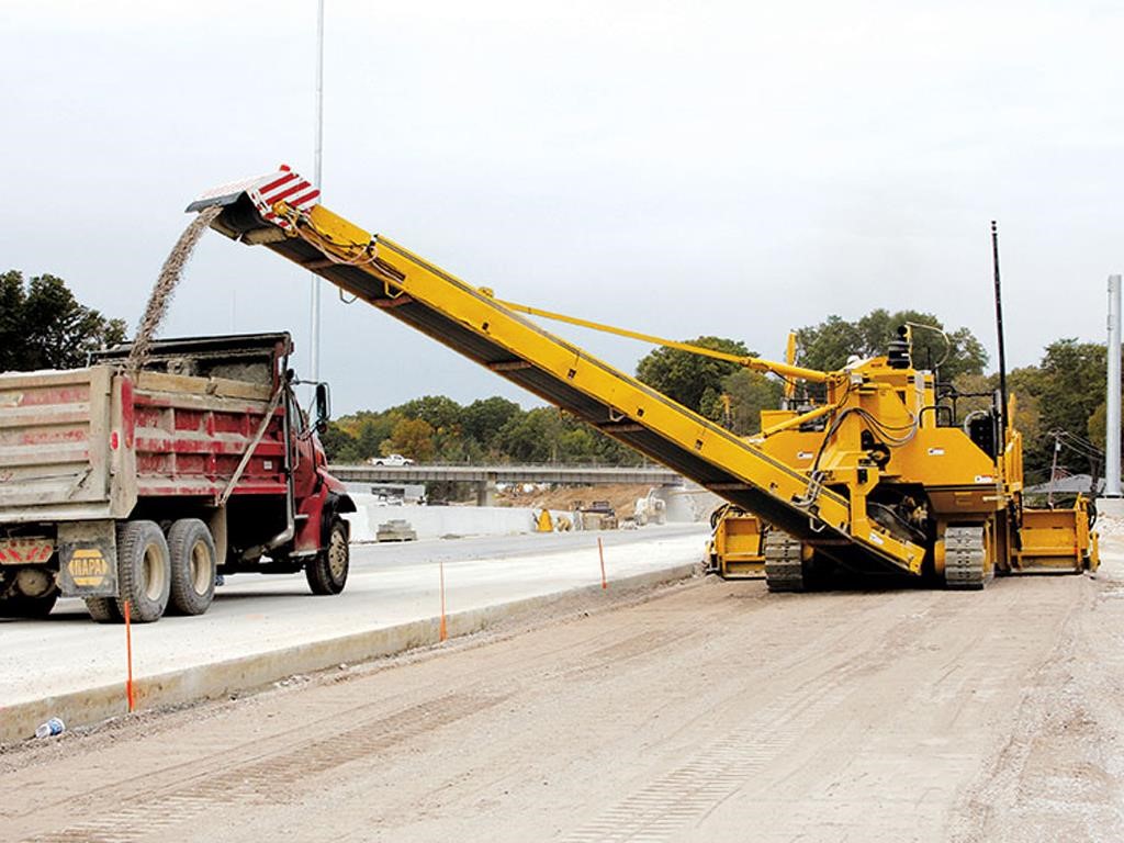 The 35 foot (10.67 m) long by 36 inch (914 mm) wide rear hydrostatic conveyor on the 9500 provides quick and accurate placement of material in the trimming or placing operation. The rear conveyor has a 160 degree hydraulic swing and hydraulic height adjustment up to 16.2 feet (4.94 m), allowing a maximum reach to easily place trimmed material past an adjacent lane, over stringline, or directly into haul units.