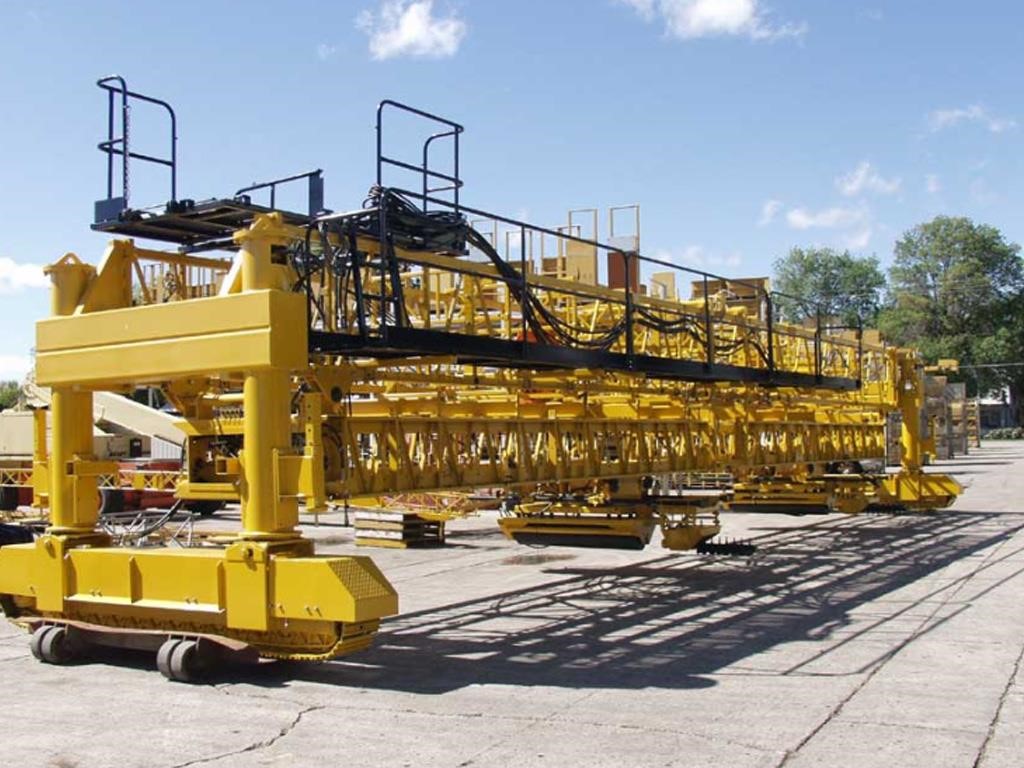 The CF-790 canal finisher has welded steel tubular lattice-type upper structure with end-car mounted crawler tracks. The finisher sub-frame is made up of welded high strength steel lattice panels, with pin-connected sections providing fast setup time and the versatility to fit exact job requirements for frame widths up to 72 ft. (21.95 m). Bottom wedge assemblies allow the CF-790 to accommodate slopes from 4:1 to 1:1. The finisher bottom frame can be partially disassembled, and the remaining slope frames along with the finishing carriages can be winched up under the upper structure for moving in and out of canals.