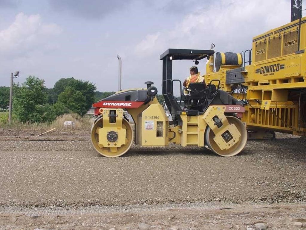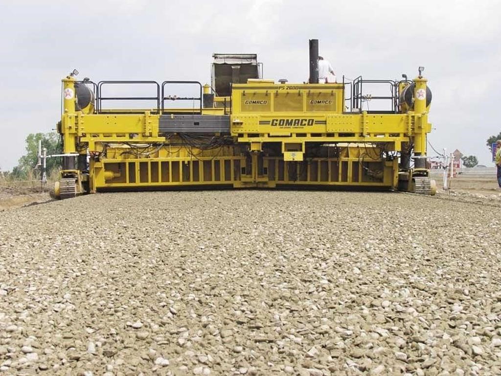 An RTP-500 was used to feed the rock from dump trucks into the rock hopper on a PS-2600 placer/spreader. Workers followed the RTP-500 with rolls of geotextile separator, rolling it out on the grade. The PS-2600 placed the rock on top of the separator at the proper thickness. A double-drum roller followed behind and made three passes across the grade. A GOMACO GP-2600 slipform paver was then brought in to pave the 25.6 foot (7.8 m) passes.