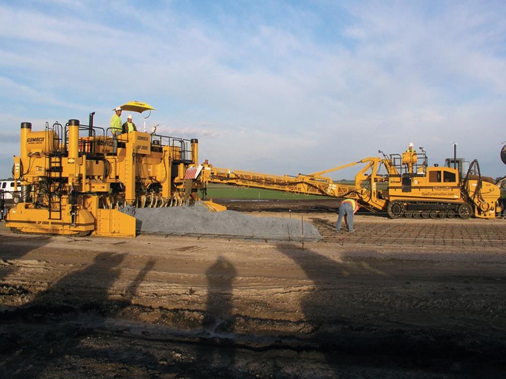 High-production results are achieved with the versatility of the long placing conveyor. The conveyor is 35 feet (10.67 m) long and 36 inches (914 mm) wide, with 170 degree hydraulic swing, and 12 feet (3.66 m) of hydraulic elevation adjustment.