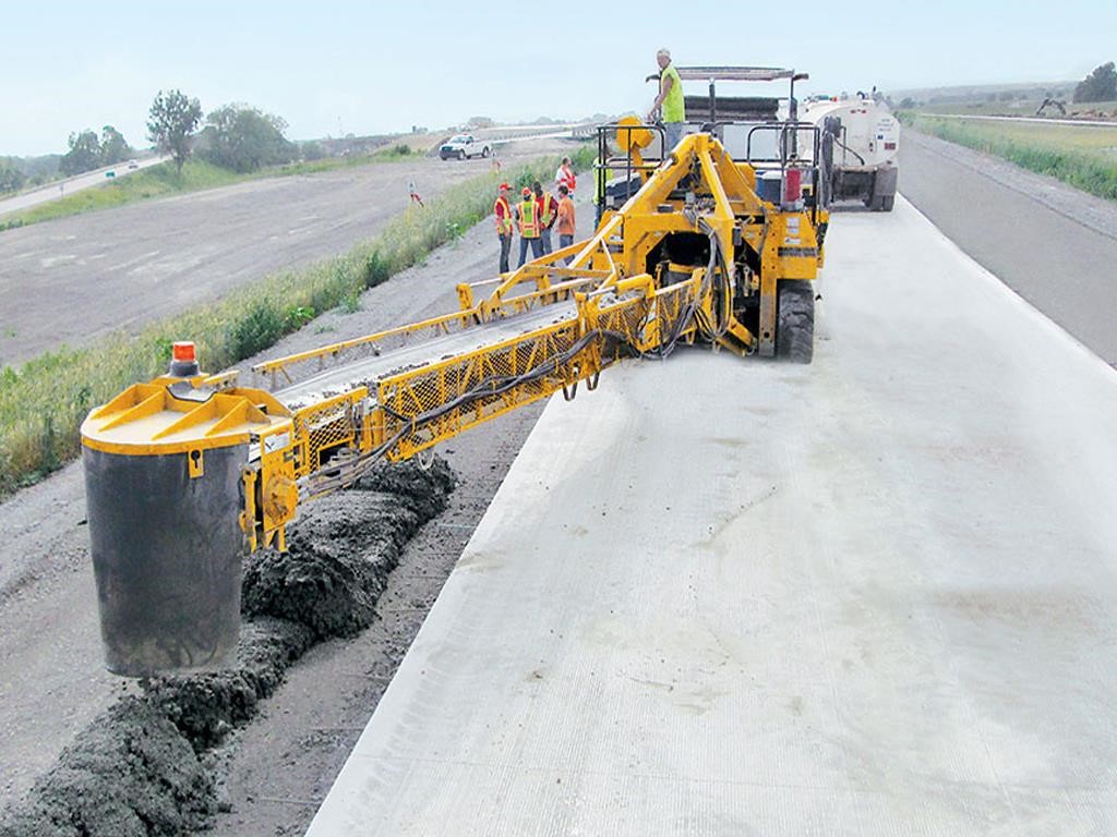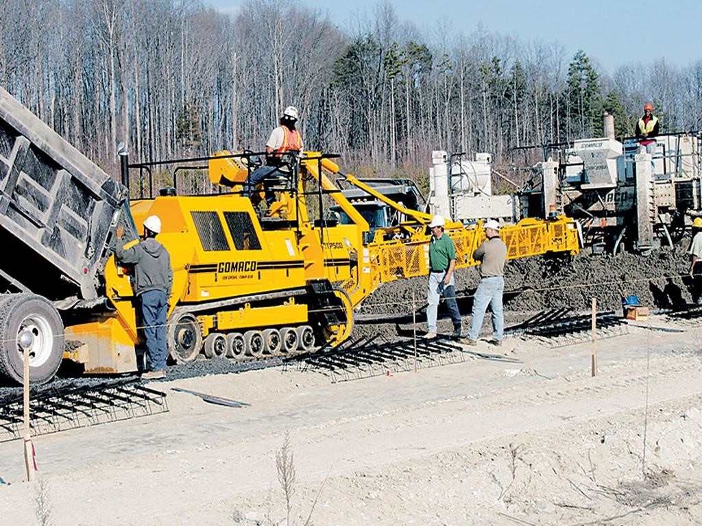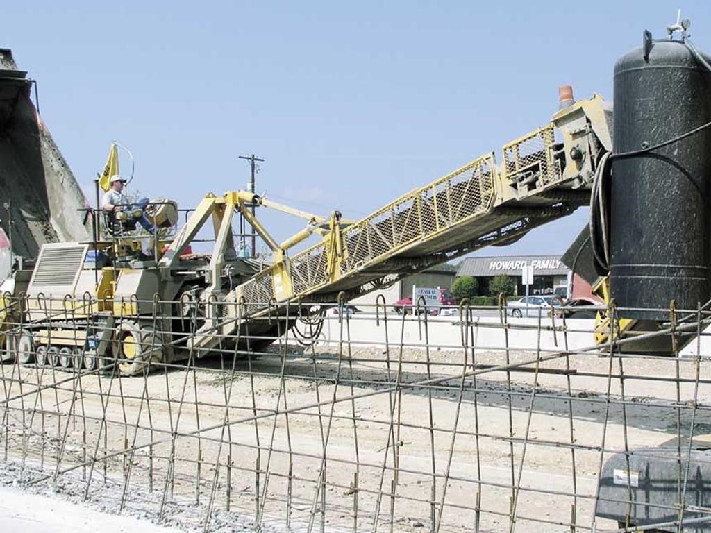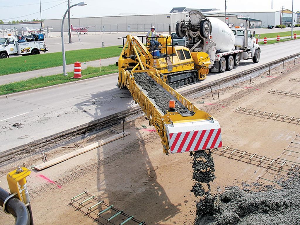 The placing conveyor allows for fast and accurate material placement from the haul road, over the stringline or other obstacles, and reaches across the grade. The conveyor deflector directs the flow of concrete at the discharge end of the conveyor.