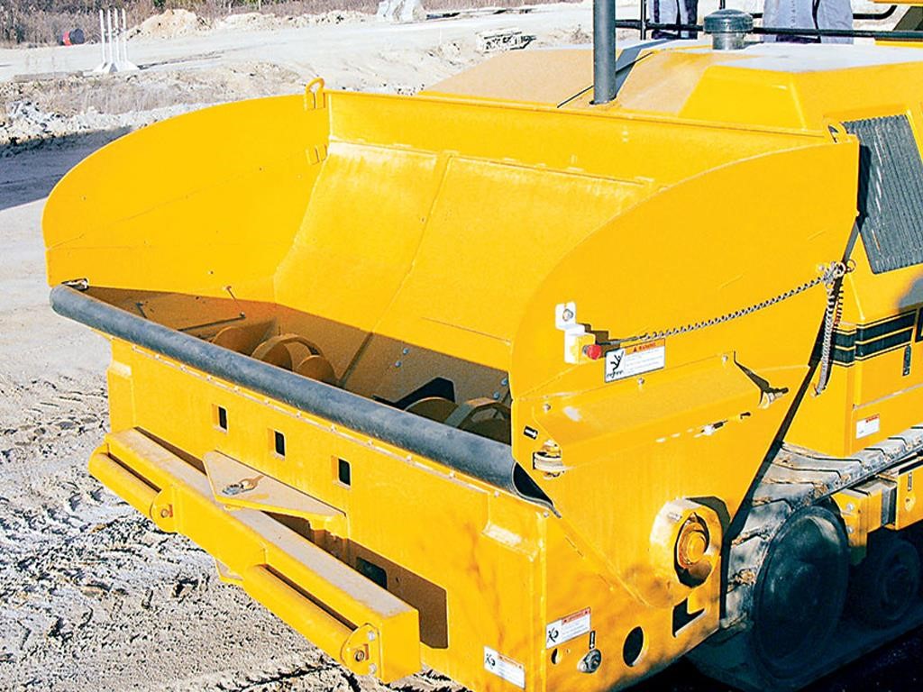 The auger-style receiving hopper is 10.75 feet (3.28 m) wide, and has a working capacity of 4.75 yd3 (3.63 m3). It’s built with the strength and durability for handling high-volume throughput for end-dump paving operations. The hopper features a 12 inch (305 mm) hydraulic vertical adjustment to allow for variable gate height on dump trucks. A 14 inch (356 mm) diameter auger with split flighting and speeds up to 88 rpm quickly moves the material to the transfer conveyor. Shaft-mounted eccentric vibrators provide vibration for emptying the hopper after each load and increased flowability. The hopper/truck seal is supported by a hydraulically tensioned cable for consistent sealing on a wide variety of dump truck bodies. The 36 inch (914 m) wide, 16.6 foot (5.06 m) long transfer conveyor moves material to the rear placing conveyor at speeds up to 608 feet per minute (185 mpm). Both conveyors are activated with a single switch and have individual speed controls.