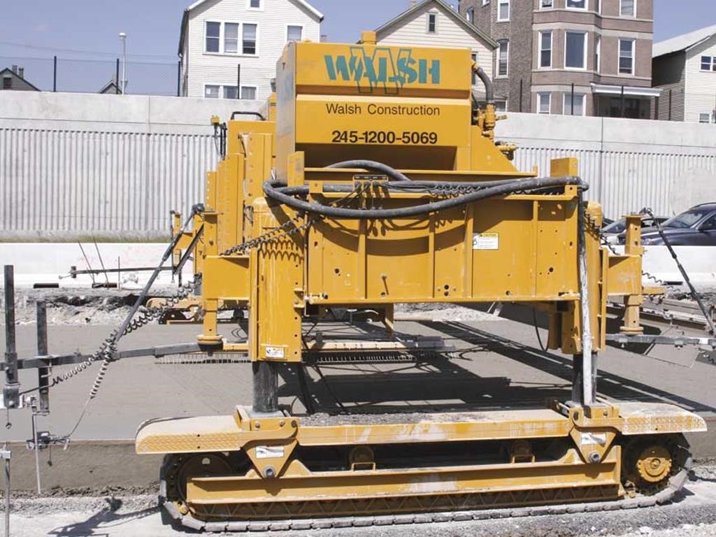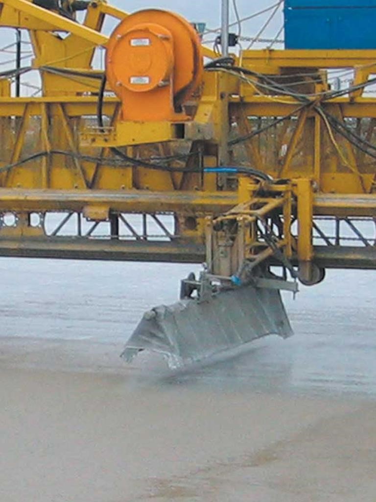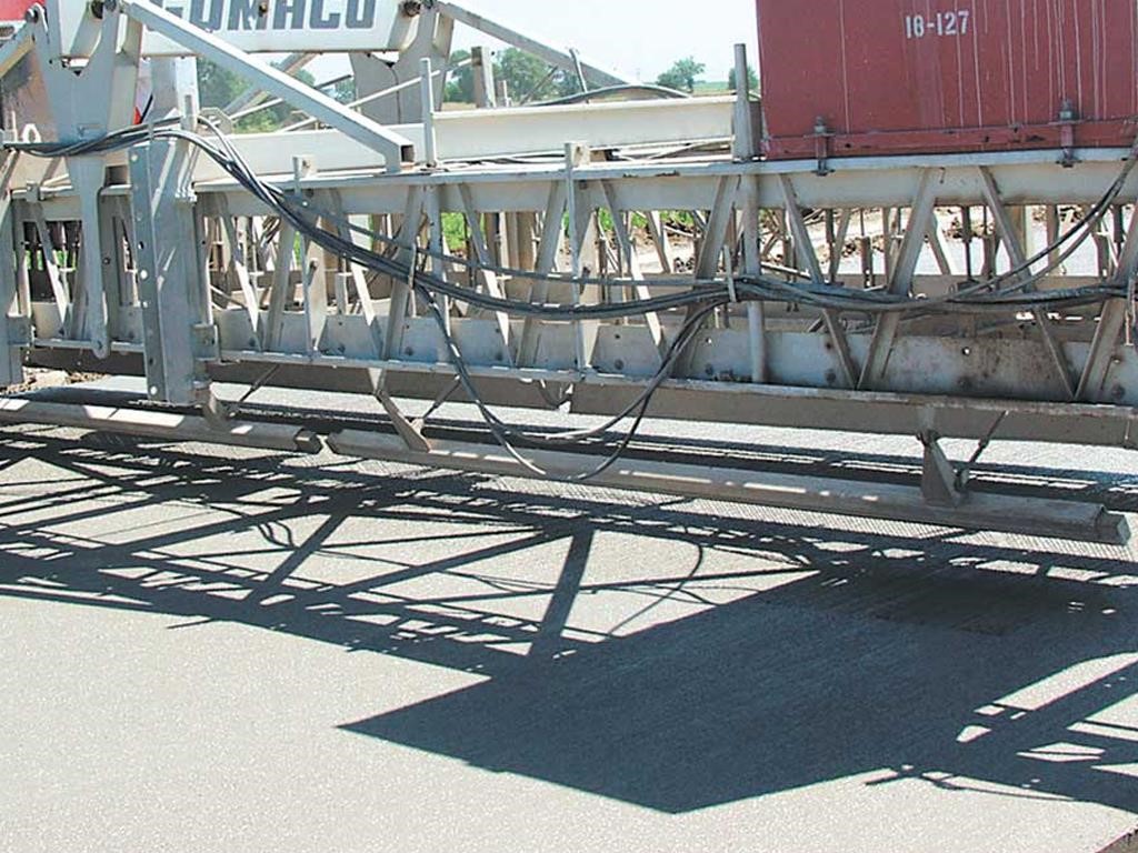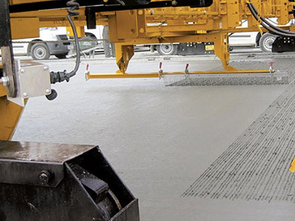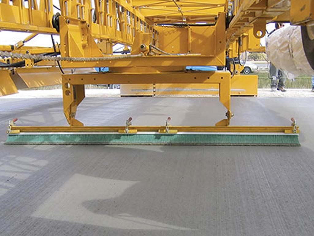 • The texturing assembly travels transversely across the width of the concrete slab. Carriage speed is variable, up to 168 feet per minute (51 mpm). Texturing wire tine members automatically pivot to trail at the end of each pass, and adjustable pressure on surface contact between the texturing member and the concrete controls the depth and angle of the wire tines. Longitudinal texturing is available where required by project specifications.