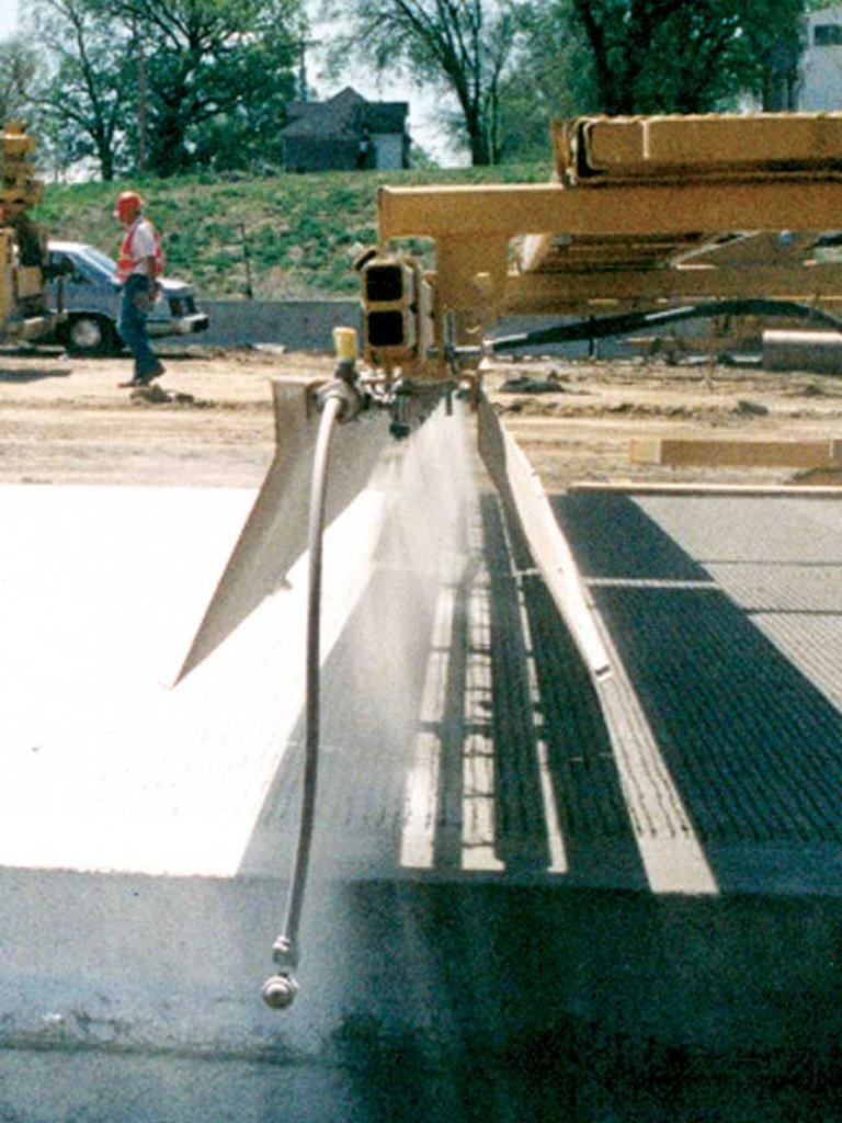 • Curing assembly includes a reservoir with hydraulic motor, pump, and controls. The spray bar has nozzles spaced 12 inches (305 mm) apart and adjustable height above the surface of the concrete for even coverage. The optional transverse curing system allows you to simultaneously texture and cure, saving you time and money.