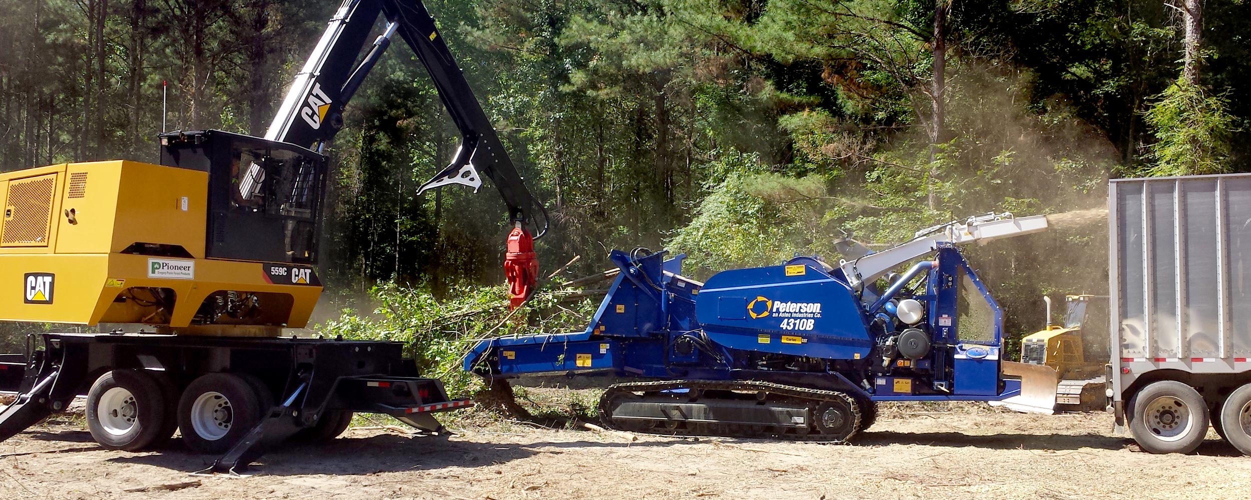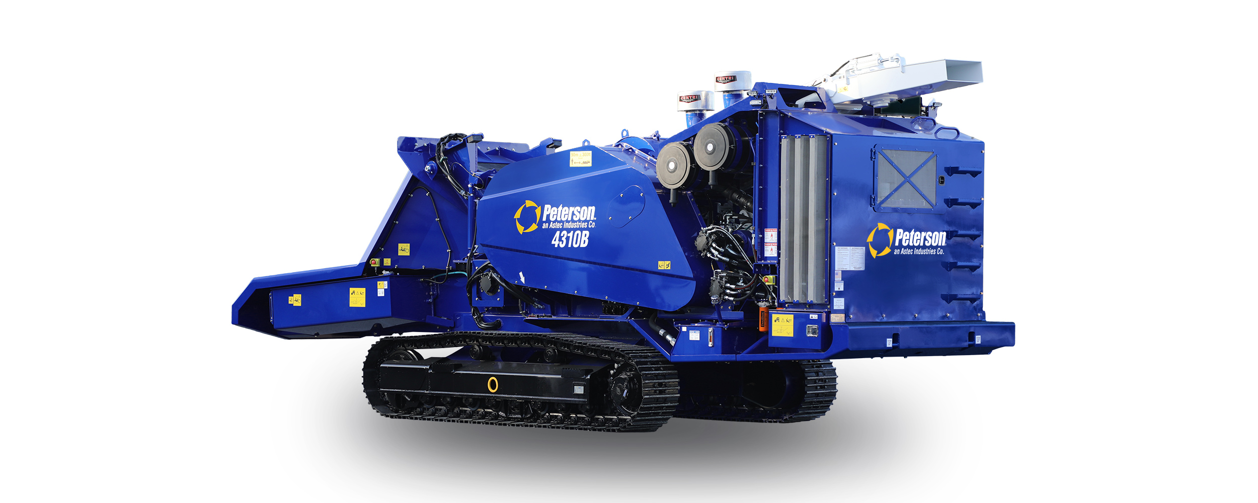 The track mounted 4310B Drum Chipper is suited for high volume biomass producers who have a wide variety of feed material from brush and small feed stock to logs up to 24 inches (61 cm) in diameter. The 4310B is powered by a 755 horsepower (563 kW) C18 Tier IV Caterpillar engine. At 58,500 pounds (26 535 kg), the track mounted 4310B Drum Chipper is designed for operations requiring high production and frequent moves between jobs.