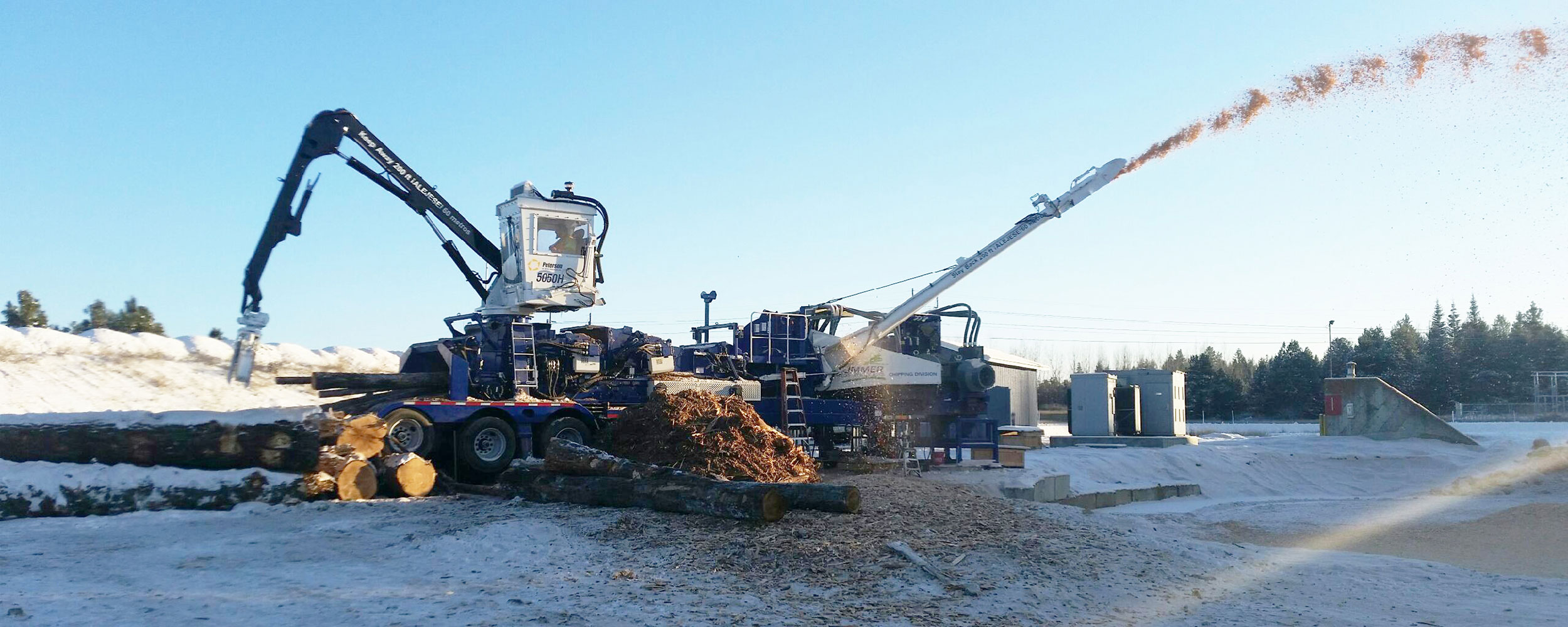 The stationary, electric Peterson 5050H Delimber Debarker Disc Chipper produces high quality low bark content chips for wood pulp and pellets, processing whole trees in one continuous operation. Equipped with a large feed throat, the 5050H can accept up to a 23-inch (56 cm) diameter single tree or multiple smaller stems.