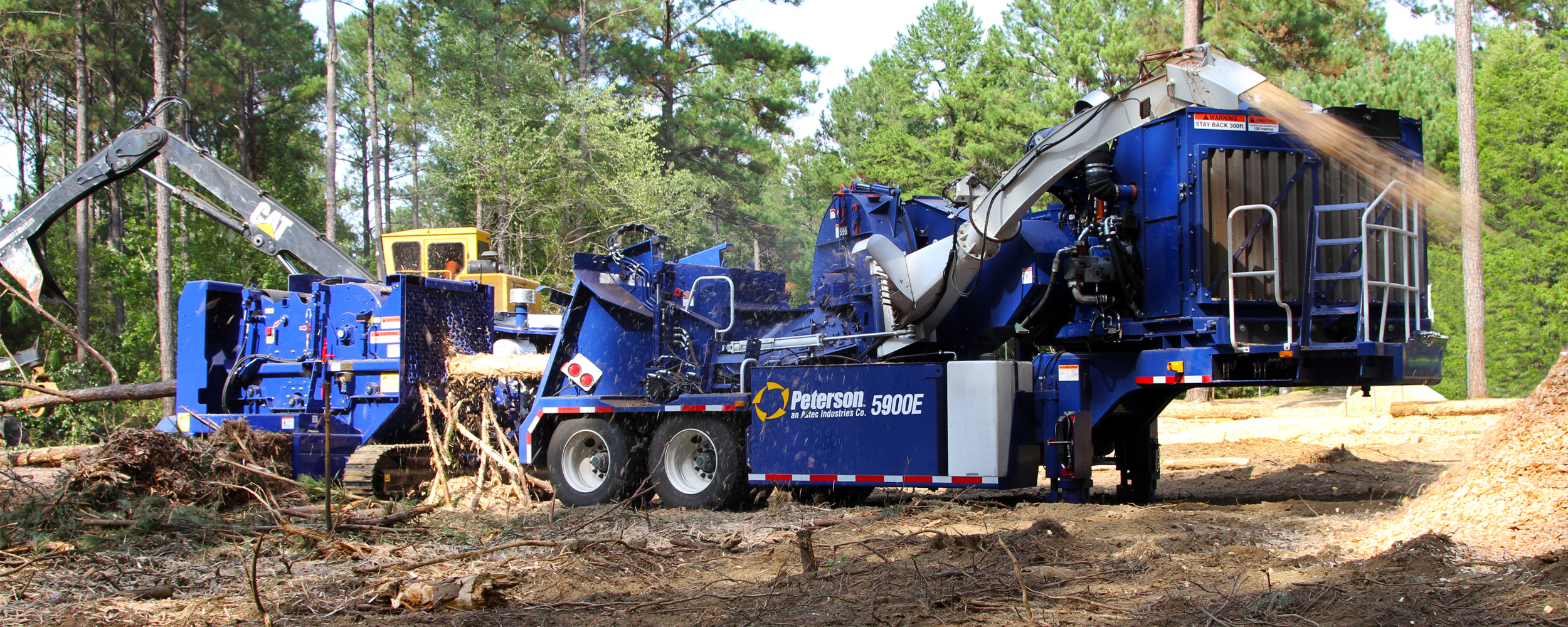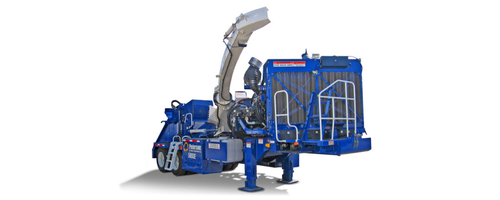 The Peterson 5900E disc chipper produces high quality paper chips when used with a Peterson 4800F debarker, or fuel chips as a stand alone fuel wood chipper. The 5900E is powered by a Caterpillar C18, Tier III, 765hp (570kW) engine, which is both fuel efficient and maintenance friendly.
