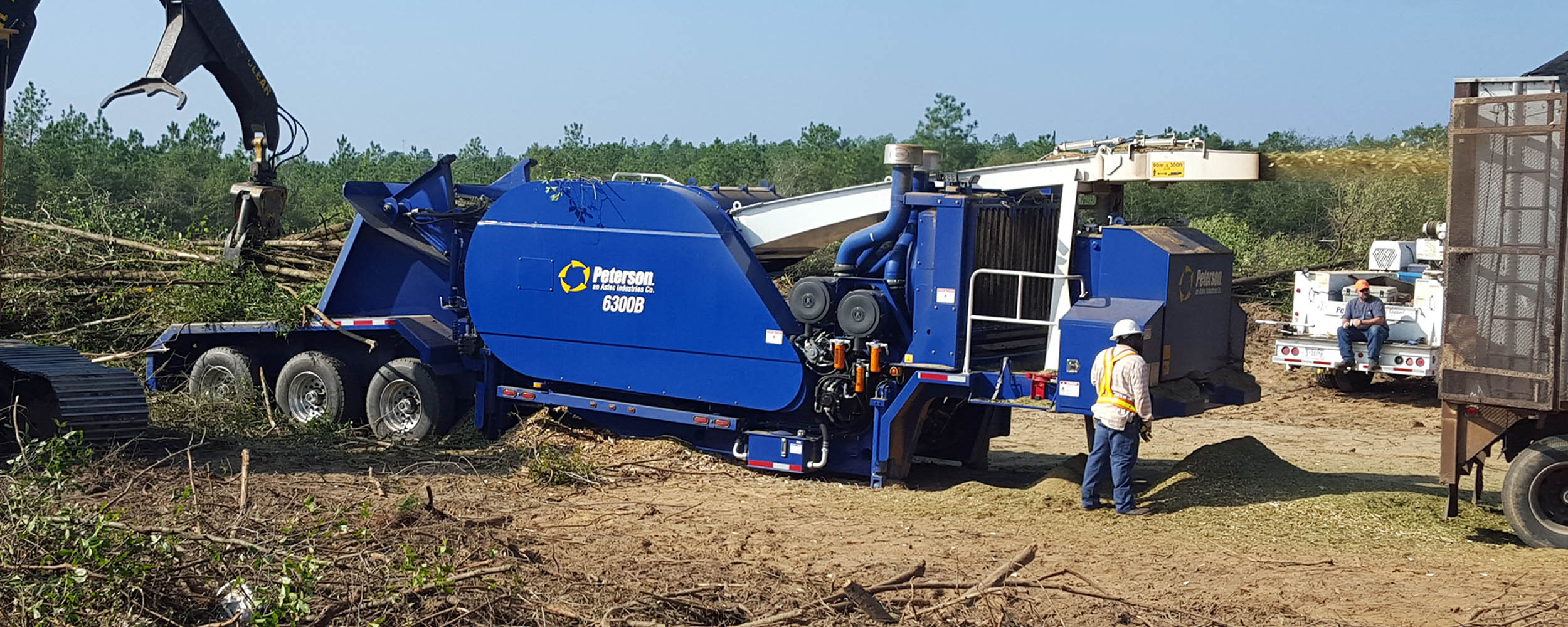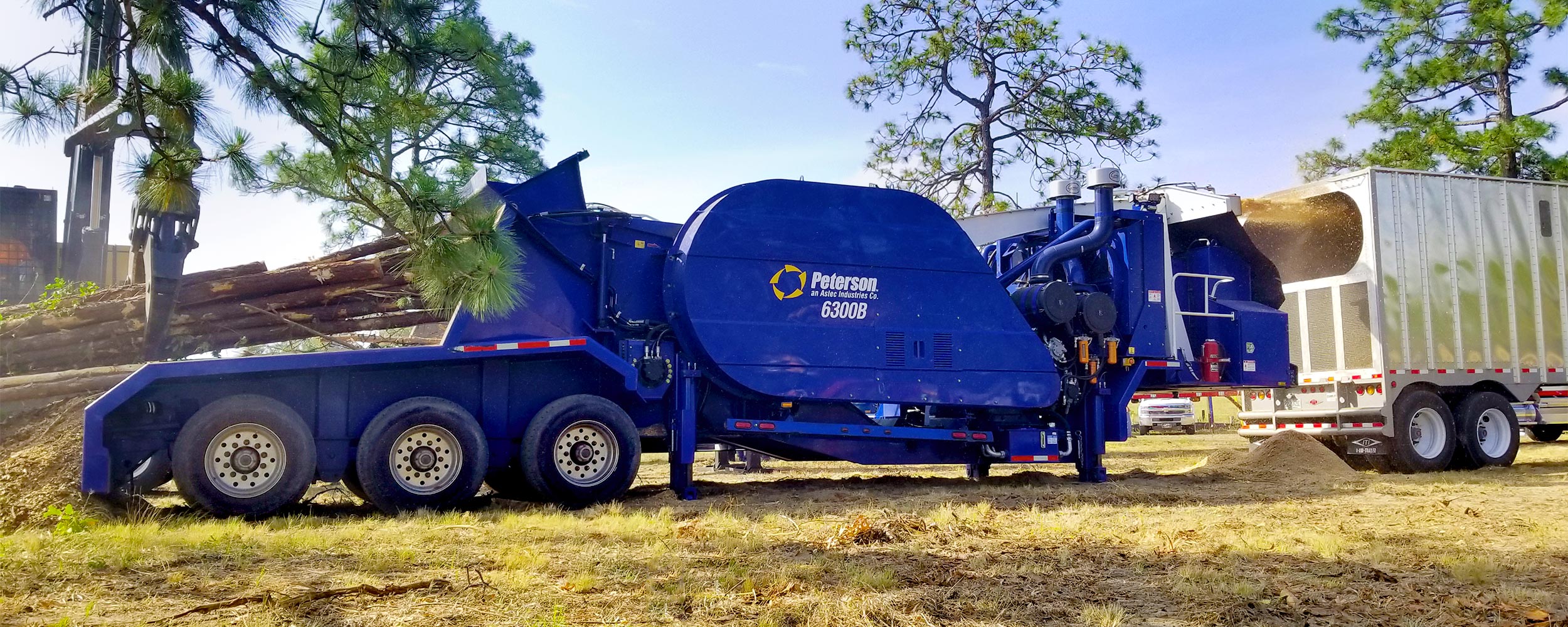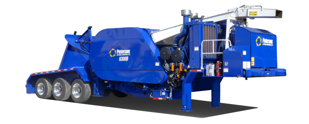 The 6300B Drum Chipper has two drum configurations, a 8-pocket drum to make standard biomass chips, or a 16-pocket drum to make microchips. An optional grate system has been redesigned to allow for adjustment from a microchip to a 1¼” chip with the same grates. Traditional Babbitt type knife systems are standard equipment, or an optional key knife system is available. Peterson’s chip accelerator system, adds load density, or throws chips well away from the machine for land clearing operations.