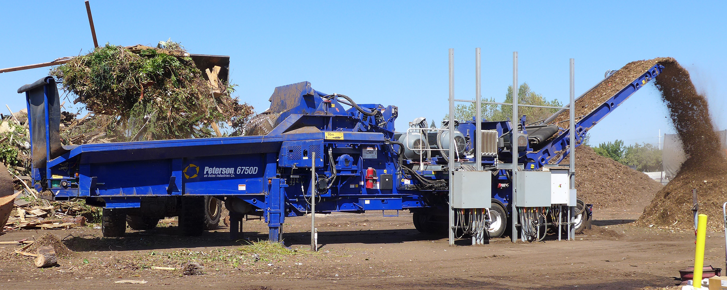 The Peterson 6750D Horizontal Grinder is the electric powered version of the popular trailer mounted 6700D. Highly productive and efficient, it hits the “sweet spot” in the Peterson grinder product line. Powered by twin 600 HP (450 kW) electric motors with either soft-start or Variable Frequency Drive (VFD) starter control packages, the 6750D is ideal for stationary or semi-stationary operations. Electric power costs are typically much lower than diesel fuel costs, and in today’s changing economy, electric power may be the answer to increasing your profits.