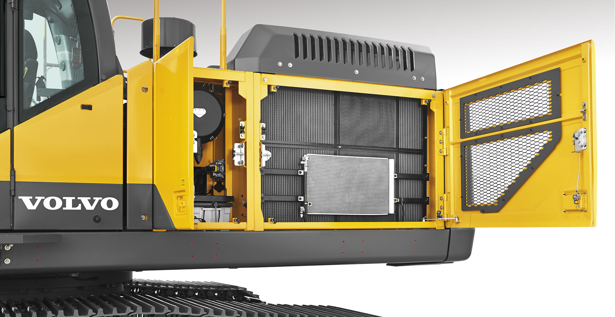 • The radiator, charged air cooler and hydraulic oil cooler are situated side-by-side on a single layer to maximize efficiency, reduce blockages and aid cleaning.