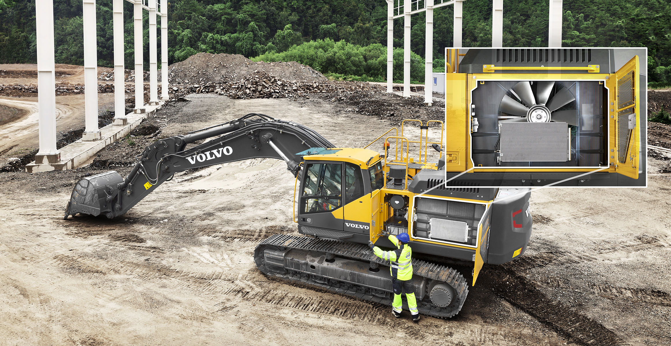 - The radiator, charged air cooler and hydraulic oil cooler are situated side-byside on a single layer to maximize efficiency, reduce blockages and aid cleaning.