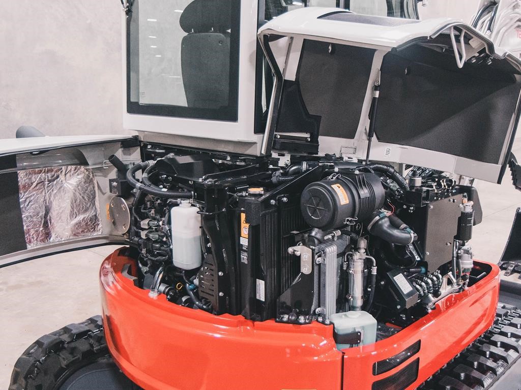 • A lockable swing out engine cover provides excellent access to daily inspection and maintenance points, and a right-side cover that opens overhead allows you to easily access the fuel tank with sight gauge, hydraulic tank, hydraulic oil level sight gauge, and battery.