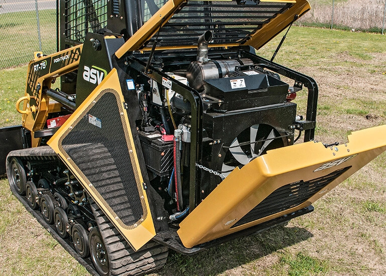 • ASV designed the machine with serviceability in mind, giving operators easy access to the reliable Cummins engine through a three-panel hood and tilting cooler arrangement. The design, paired with sight gauges for both hydraulic oil and coolant, simplify routine inspections of filters, oil and normal service items. The rearward tilting cab provides easy accessibility when further service is required and the RT-75 can be paired with all standard attachments, such as backhoes, buckets, snow blades, brush cutters and pallet forks.