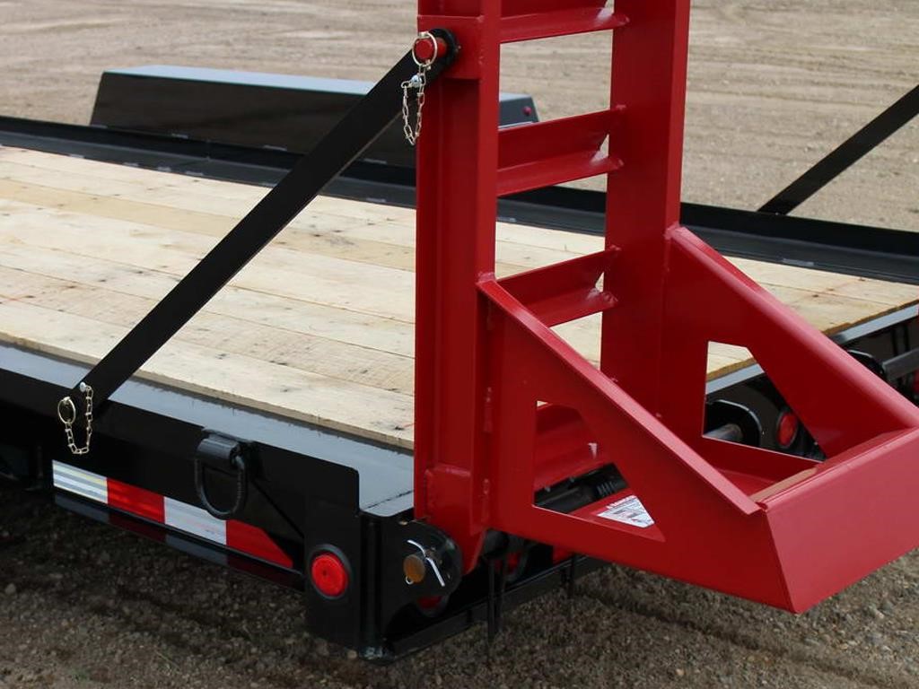The Towmaster® T-series large drop-deck trailer is designed for hauling larger mid-sized equipment. This model is built on a stout cold-formed I-beam tongue and main frame and features a 3-inch lip around the deck. The oak wood deck is supported by strong 3-inch I-beam crossmembers and Dexter® Torflex® rubber torsion axles give it a smooth ride. This trailer features a bolt-on parking jack, LED lights, sealed wiring harness, spring-assist ramps, and a solid bar ramp hold-up.