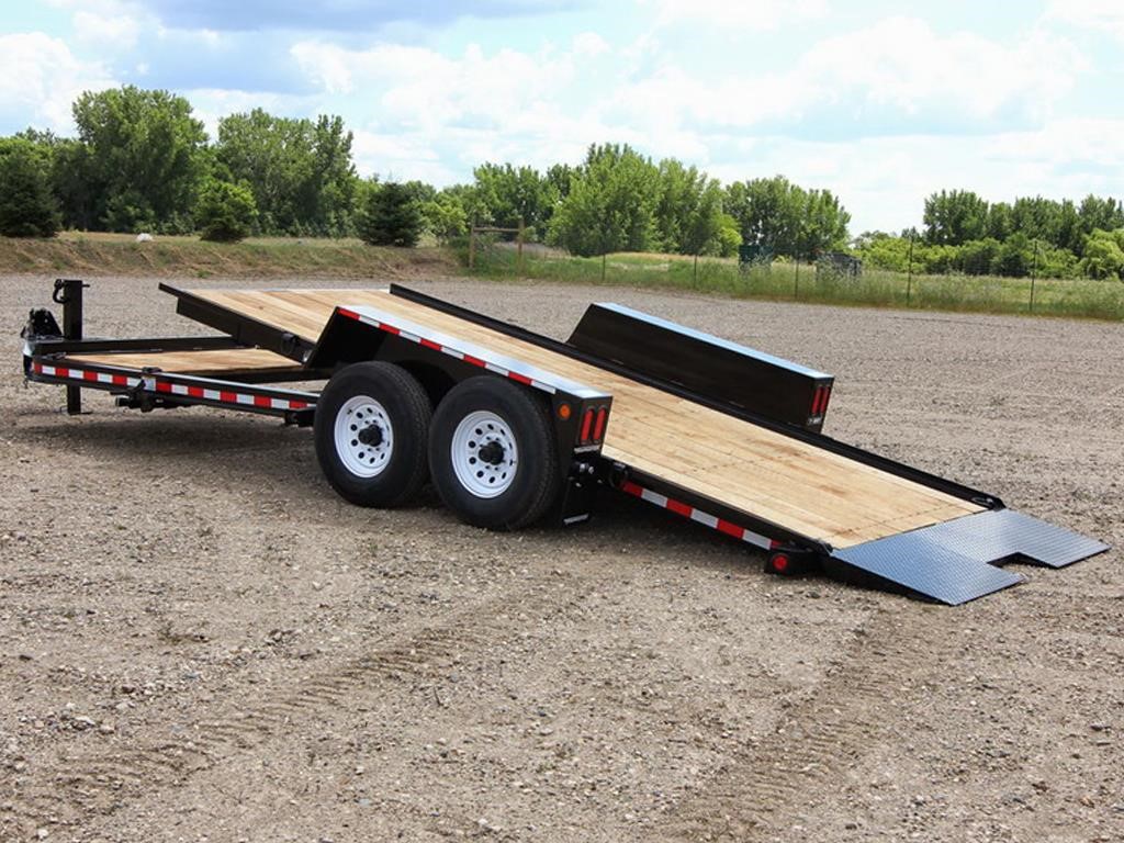 The Towmaster® drop-deck tilt trailers are popular with rental dealers and small contractors. There are no ramps to hassle with; simply tilt the deck and drive on or off. This trailer is built on our cold-formed I-beam tongue and main frame for tough durability. The tilt deck trailer features a single lever twin-latch system, knife-edge approach plate, rubber-ride axles and adjustable hitch. A deck cushion cylinder eases the deck back into transport position and prevents equipment from slamming the deck down.