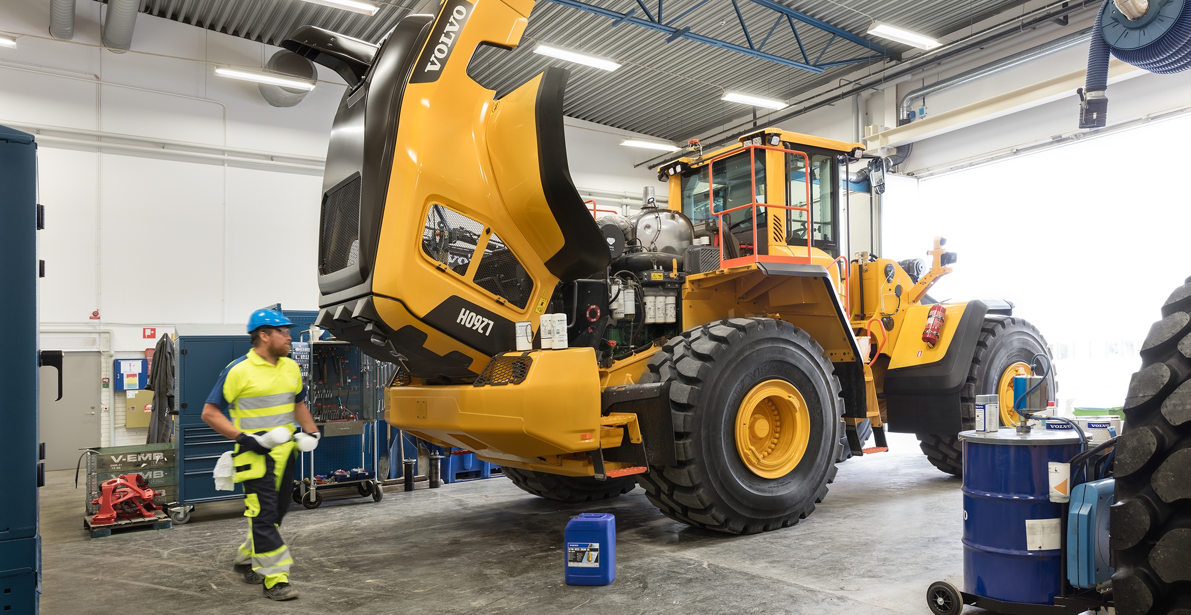 • The Volvo cab can be tilted to either a 30º or 70º angle and the wide-opening engine hood is operated electronically.