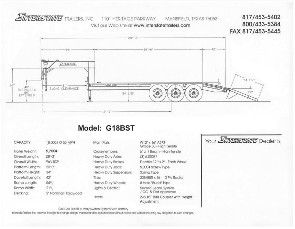 Specifications Downloads & Documentation Width: 96″ / 102″ OPT Tail: 3′ 6″ Weight: 4,850 lbs Overall: 27′ 3″ Deck: 16′ 6″ Capacity: 18,000lbs @ 55mph Height: 34.5″ unloaded Spec Sheet G18BST Interstate Trailers Print Page Email Page Contact Us (419) 693-5000 Request Quote
